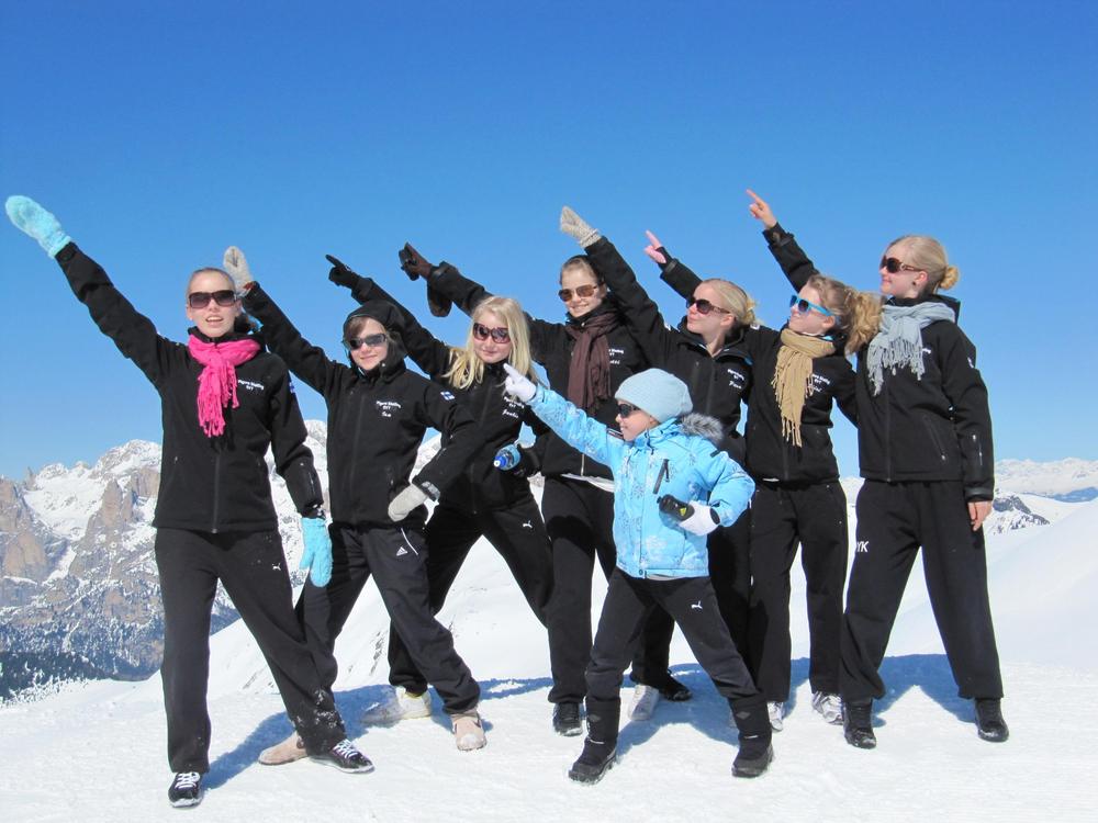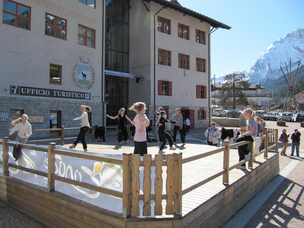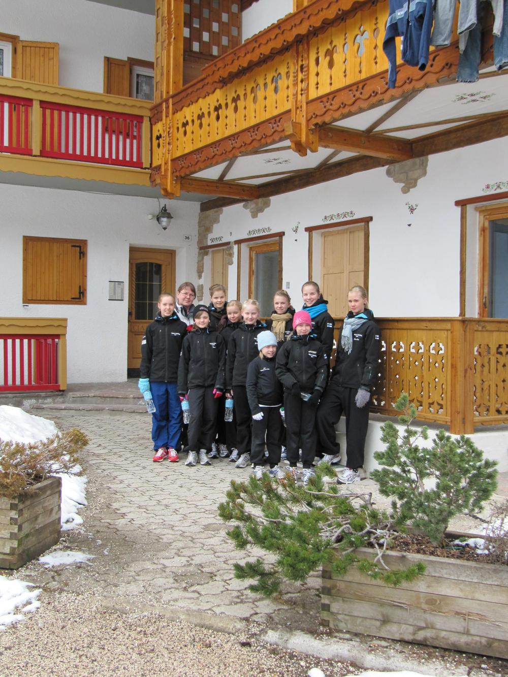 Kello oli kymmenen ja istuimme kaikki aamiaispöydässä. Aamupalana oli puuroa, leipää ja jogurttia. Kaikki olivat innoissaan tulevasta päivästä. Syötyämme lepäsimme hetken ennen kuin lähdimme kohti Canazein keskustaan. Matkaa oli noin 3 kilometriä ja matkalla näimme pienen hevosaitauksen, jossa tepasteli noin 10 suloista ponia. Rapsuttelimme niitä hetken aikaa ja pian jatkoimmekin matkaa. Canzein keskusta oli pieni tori, jonka ympärillä oli muutamia kauppoja. Aloitimme oheisharjoitukset pienellä, puisella esiintymislavalla. Harjoitukset sujuivat mukavasti venytellen, hyppien akseleita, kierroshyppyjä ja tehden lajiliikkeitä. Meistä tuli paikallinen nähtävyys. Monet ottivatkin meistä kuvia. Katselimme jonkin aikaa kauppojen näyteikkunoita, jotka olivat kiinni, koska oli siesta. Odottelimme hetken aikaa bussia, mutta osa päättikin lähteä kävelemään. Matkalla rapsuteltiin taas poneja. Lounaaksi oli kalakeittoa, joka näytti maistuvan melkein jokaiselle. Masut täynnä jatkoimme lepäilyä. Petran oli aika lähteä harjoituksiin, mutta Eve oli vielä Suomen ajassa, ja oli katsonut tuntia liian aikaisin, joten Petra ja Eve tekivät happihyppelyä. Petra oli kuitenkin arvonnassa ja sai numerokseen 1.!! Kaikilla alkoi olla jo nälkä ja Minna valmisti herkullisen hyvää kanaa ja riisiä. Useimmat eivät malttaneet pysyä housuissaan, koska he odottivat niin innoissaan pääsyä jäälle. Tulimme myöhään harjoituksista ja olikin jo nukkumaanmenoaika.