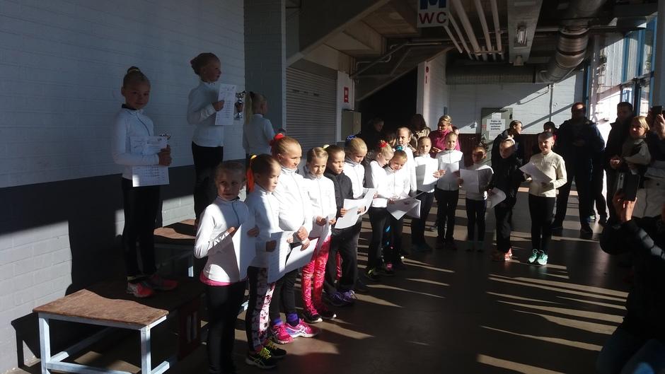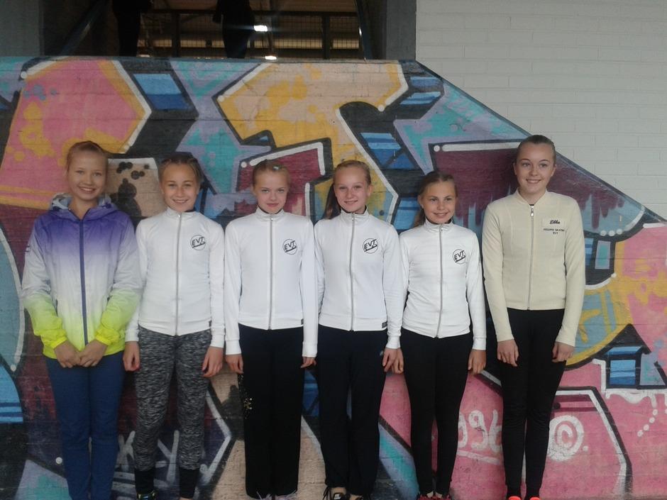 EVT:n iloiset noviisit odottamassa palkintojen jakoa. Pinja, Alisa, Janette, Jade, Frida ja Ella